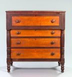 Attractive American Sheraton Figured Maple and Cherry Bonnet Chest, second quarter 19th century, the projecting upper drawer over a graduated bank of three drawers, flanked by reeded, turned and foliate-carved columns, raised on turned legs, h. 46-5/ Attractive American Sheraton Figured Maple and Cherry Bonnet Chest, second quarter 19th century, the projecting upper drawer over a graduated bank of three drawers, flanked by reeded, turned and foliate-carved columns, raised on turned legs, h. 46-5/