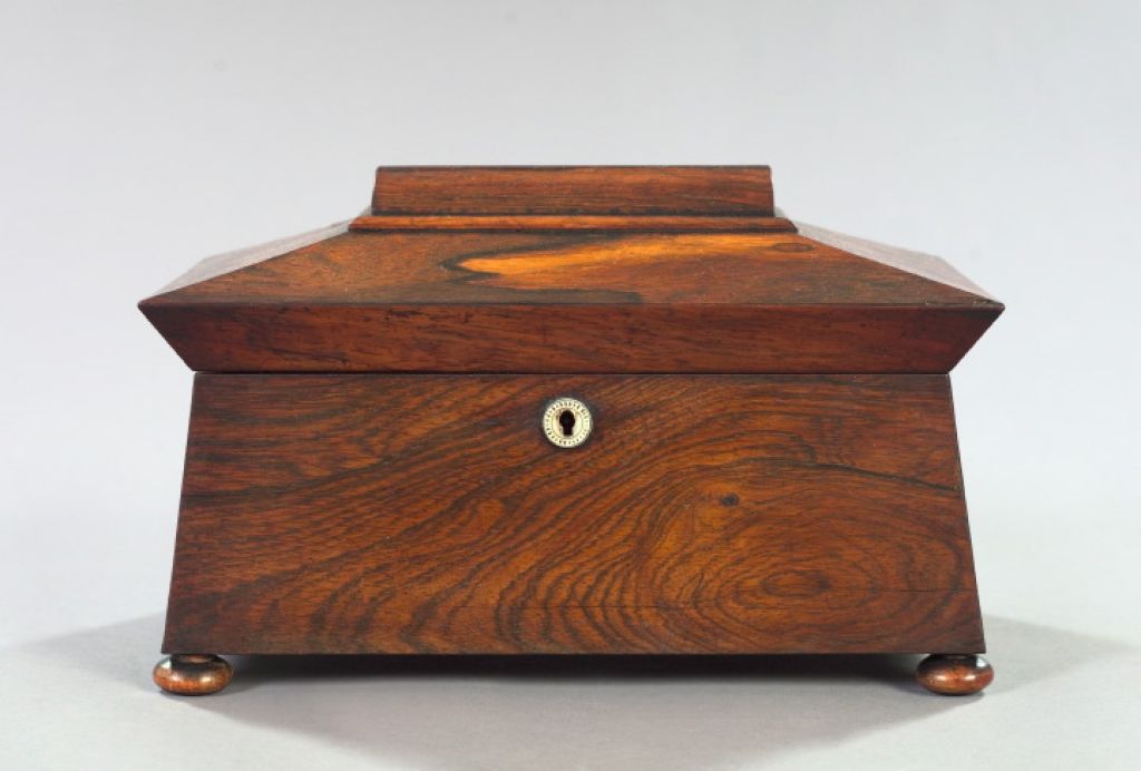 Attractive William IV Rosewood Triple-Compartment Tea Box, second quarter 19th century, of sarcophagus form, the interior compartments fitted with conforming covers centered with carved mother-of-pearl grips of button form, the center compartment ret Attractive William IV Rosewood Triple-Compartment Tea Box, second quarter 19th century, of sarcophagus form, the interior compartments fitted with conforming covers centered with carved mother-of-pearl grips of button form, the center compartment ret
