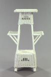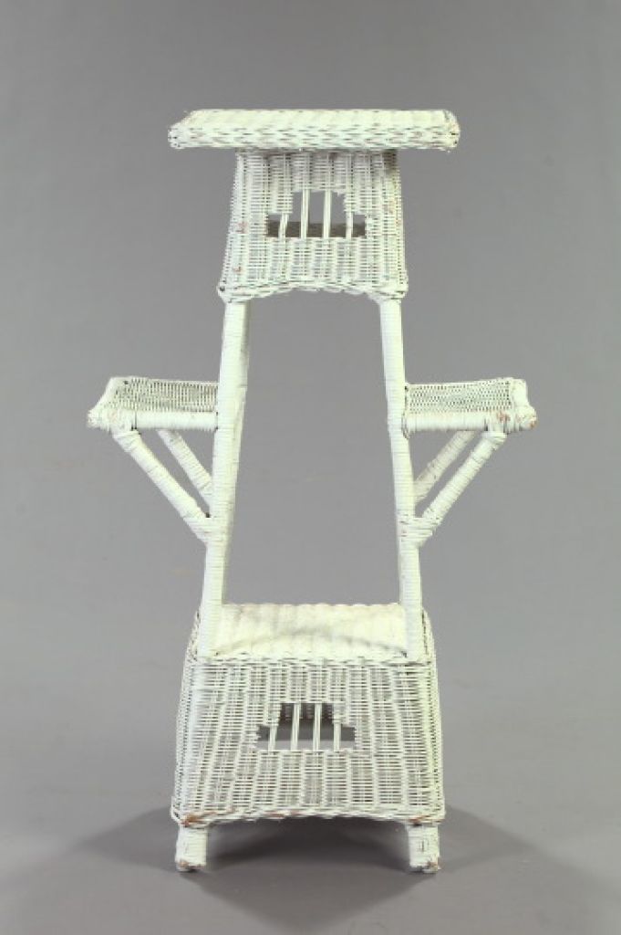 American Late Victorian Wicker Plant Stand, early 20th century, the central stand with an interior lower shelf and flanked by two exterior side shelves, h. 42", w. 25", d. 15". American Late Victorian Wicker Plant Stand, early 20th century, the central stand with an interior lower shelf and flanked by two exterior side shelves, h. 42", w. 25", d. 15".