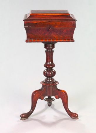 Fine Victorian Rosewood Sewing Stand, mid-19th century, of Regency inspiration, the hinged lid with large molded edge opening to a void interior, mounted to a turned and carved standard with three outstretched cabriole-form legs, h. 29-1/2", w. 14-1/ Fine Victorian Rosewood Sewing Stand, mid-19th century, of Regency inspiration, the hinged lid with large molded edge opening to a void interior, mounted to a turned and carved standard with three outstretched cabriole-form legs, h. 29-1/2", w. 14-1/