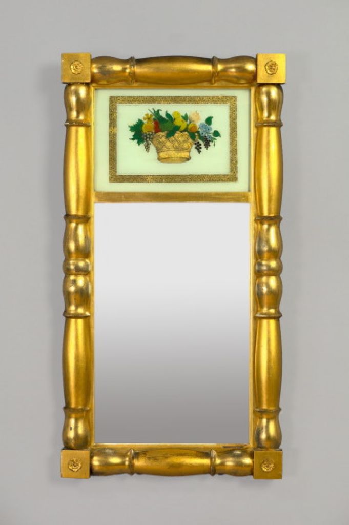 Good American Classical Giltwood and Eglomise Vertical Oblong Looking Glass, second quarter 20th century, the white-ground eglomise panel featuring a polychromed and gilded basket of flowers, the matte- and bright-finished gilding professionally rene Good American Classical Giltwood and Eglomise Vertical Oblong Looking Glass, second quarter 20th century, the white-ground eglomise panel featuring a polychromed and gilded basket of flowers, the matte- and bright-finished gilding professionally rene