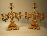 Early Pair of Bronze Candelabras with three candle holders each, with heavy design, 1800's. 16 3/4 h., 15" w. Early Pair of Bronze Candelabras with three candle holders each, with heavy design, 1800's. 16 3/4 h., 15" w.