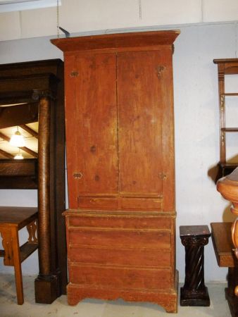 Primitive Cabinet, original red paint with two doors and two drawers at top, sitting on a base with four graduated drawers, all as one piece. Primitive Cabinet, original red paint with two doors and two drawers at top, sitting on a base with four graduated drawers, all as one piece.