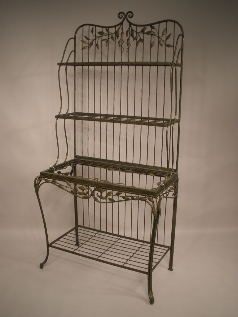 Decorative Metal Bakers Rack in gold tones with trailing leaf decoration at top, h. 72. w. 34 1/2. Decorative Metal Bakers Rack in gold tones with trailing leaf decoration at top, h. 72. w. 34 1/2.