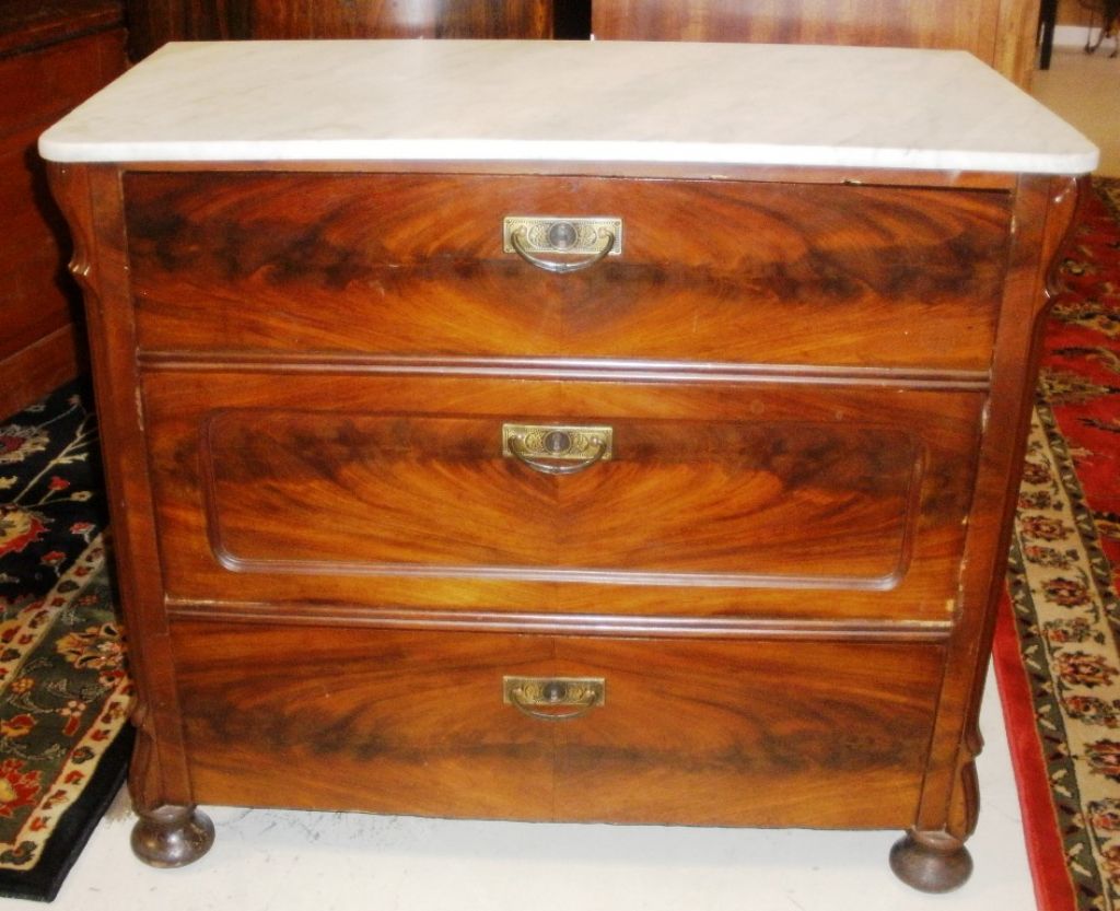 19th Century mahogany marble top dresser w/unusual Victorian pulls. Three drawers supported by bun feet. 39"w x 20"d x 32"h. 19th Century mahogany marble top dresser w/unusual Victorian pulls. Three drawers supported by bun feet. 39"w x 20"d x 32"h.