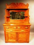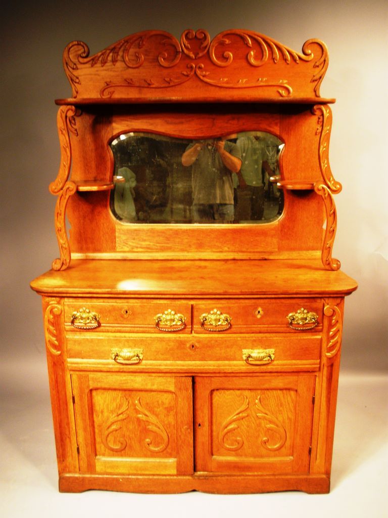Victorian Oak Sideboard. Top section having beveled glass mirror w/long shelf over two small shelves supported by carved scrolls. Bottom section is two drawers over one long drawer w/two doors beneath that. w. 48", h. 72", d. 20" Victorian Oak Sideboard. Top section having beveled glass mirror w/long shelf over two small shelves supported by carved scrolls. Bottom section is two drawers over one long drawer w/two doors beneath that. w. 48", h. 72", d. 20"