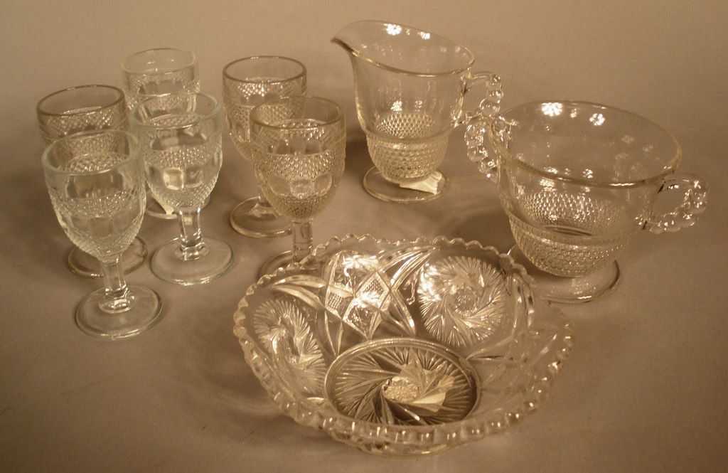 Collection of 9 Glass Items. "Near Cut" 5 1/2" bowl, six early American pattern glass 3 3/8" cordials, 3"h sugar and creamer Duncan Miller Dewdrop. Collection of 9 Glass Items. "Near Cut" 5 1/2" bowl, six early American pattern glass 3 3/8" cordials, 3"h sugar and creamer Duncan Miller Dewdrop.
