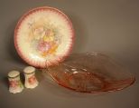 Three Assorted Items. Austrian Salt and Pepper, 2 1/2"h; Pink Depression Bowl, 12" x 9 1/2"; 1890 Royal Bonn Dish, 9 1/4" Three Assorted Items. Austrian Salt and Pepper, 2 1/2"h; Pink Depression Bowl, 12" x 9 1/2"; 1890 Royal Bonn Dish, 9 1/4"