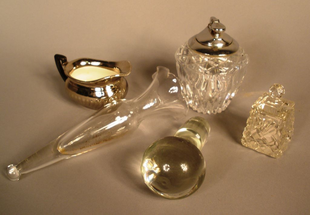 Five Assorted Items: Devonware Creamer, Silverized, 2"h; Epergne Vase, 8"; Cut Glass Condiment Jar, 3"h; stopper Five Assorted Items: Devonware Creamer, Silverized, 2"h; Epergne Vase, 8"; Cut Glass Condiment Jar, 3"h; stopper