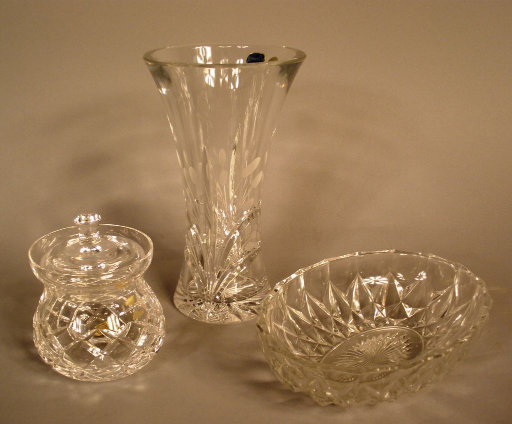 Assorted Crystal Items. Bohemian crystal vase, 8"h; crystal bowl, 7 1/2" oval; Atlantis crystal covered sugar, 4 1/2"h Assorted Crystal Items. Bohemian crystal vase, 8"h; crystal bowl, 7 1/2" oval; Atlantis crystal covered sugar, 4 1/2"h