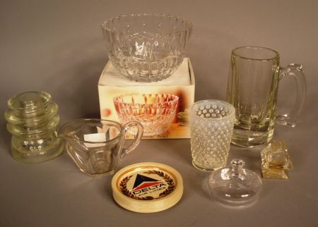 Eight Assorted Items. Heisey Creamer 2 1/2"h; Libby's Glass Mug 6"h; white hobnail cup 3 1/2"h; glass telephone insulator; metal delta airline coasters 3 1/2"; perfume bottle 1 1/2"h; crystal "Fairmont" bowl, and Delta Coasters Eight Assorted Items. Heisey Creamer 2 1/2"h; Libby's Glass Mug 6"h; white hobnail cup 3 1/2"h; glass telephone insulator; metal delta airline coasters 3 1/2"; perfume bottle 1 1/2"h; crystal "Fairmont" bowl, and Delta Coasters