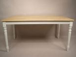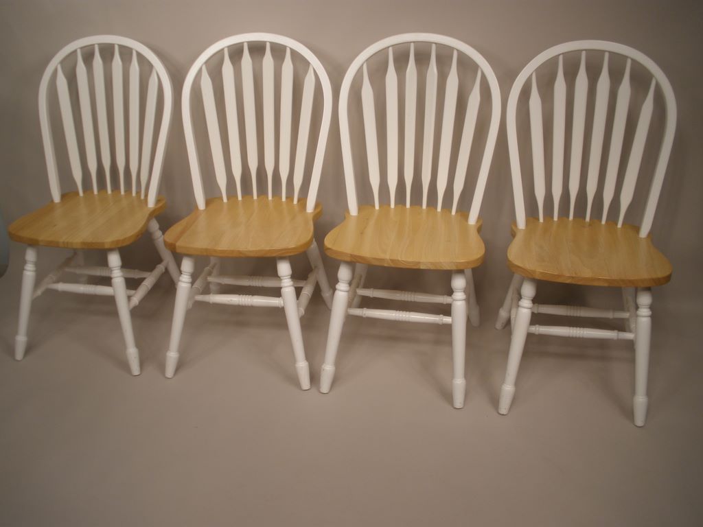 Modern Pine Dining Table with Natural Pine Top and White Painted Base and Legs., 60 L 36 d 29 1/2 H - Four Pine Chairs with white painted backs and legs and natural pine seat., 38 1/2 h 17 5/8 w Modern Pine Dining Table with Natural Pine Top and White Painted Base and Legs., 60 L 36 d 29 1/2 H - Four Pine Chairs with white painted backs and legs and natural pine seat., 38 1/2 h 17 5/8 w