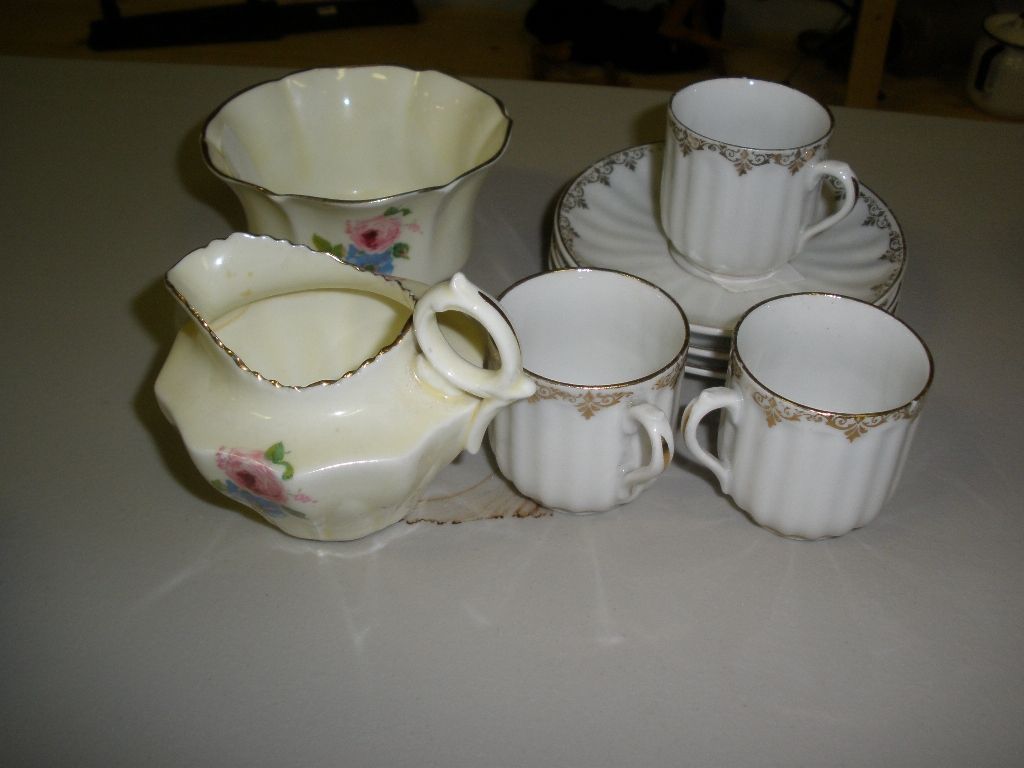 Assorted lot 8 pieces: Demi-Tesse cups and saucers KPM, creamer & sugar, fine bone china. Assorted lot 8 pieces: Demi-Tesse cups and saucers KPM, creamer & sugar, fine bone china.