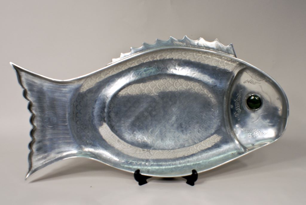 A 1975 Arthur Court Designs "Sealife Collection" large 25 1/2" x 12 3/4" aluminum fish tray with inset jadestone eye. A dramatic tray, extensively engraved, typifying the inspired work of Arthur Court's early designs. A 1975 Arthur Court Designs "Sealife Collection" large 25 1/2" x 12 3/4" aluminum fish tray with inset jadestone eye. A dramatic tray, extensively engraved, typifying the inspired work of Arthur Court's early designs.