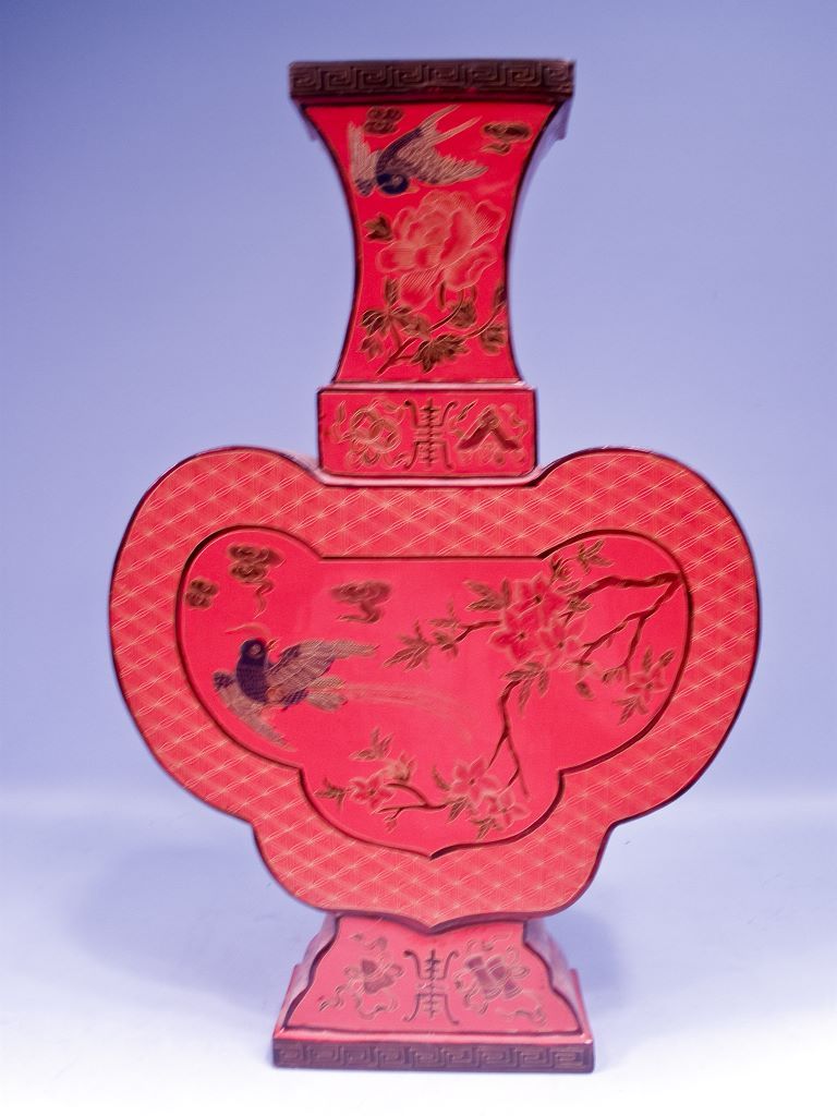 A stately Chinese red lacquer vase with incised, gilded & enameled decoration, 22 1/2"h x 14"w. A stately Chinese red lacquer vase with incised, gilded & enameled decoration, 22 1/2"h x 14"w.