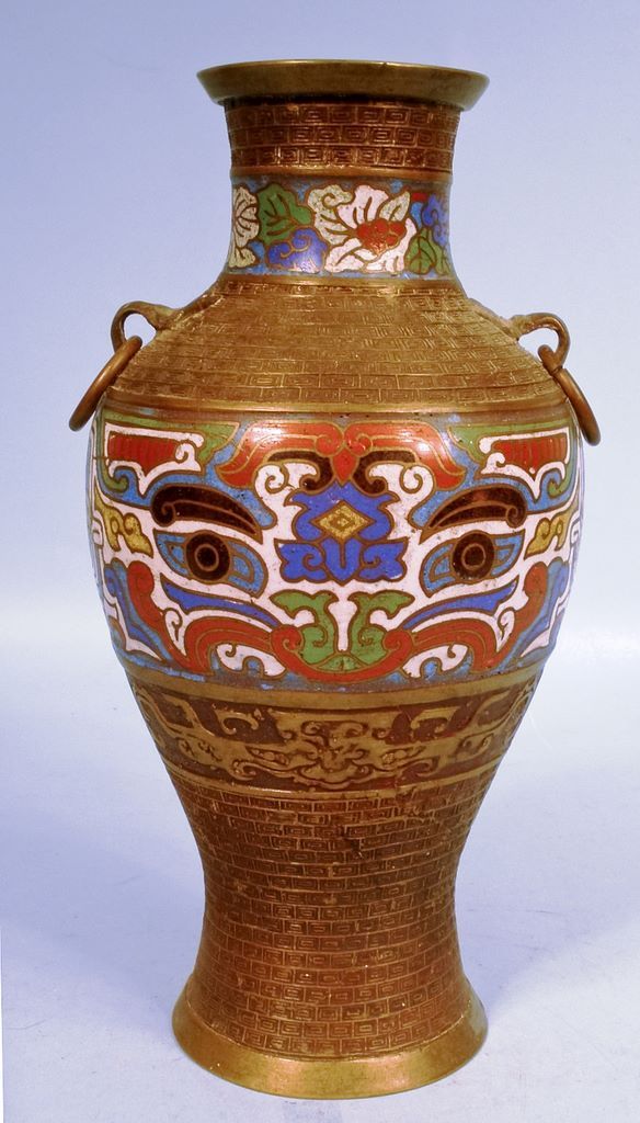 An early 20th Century Japanese 12 1/4"h champleve vase, decorated with alternating bands of engraved bronze and cloisonn An early 20th Century Japanese 12 1/4"h champleve vase, decorated with alternating bands of engraved bronze and cloisonn