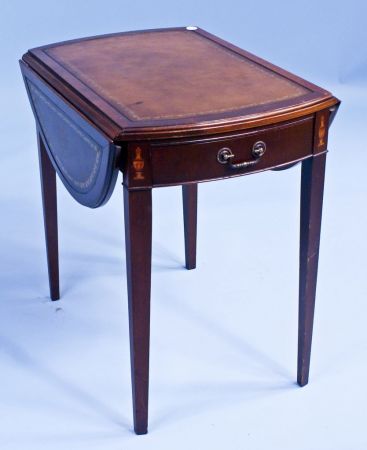 A mahogany Hepplewhite style drop leaf pembroke table with satinwood inlay, tooled leather top and original brasses, 26"d x 18 1/2"w x 25 1/2"h. A mahogany Hepplewhite style drop leaf pembroke table with satinwood inlay, tooled leather top and original brasses, 26"d x 18 1/2"w x 25 1/2"h.