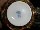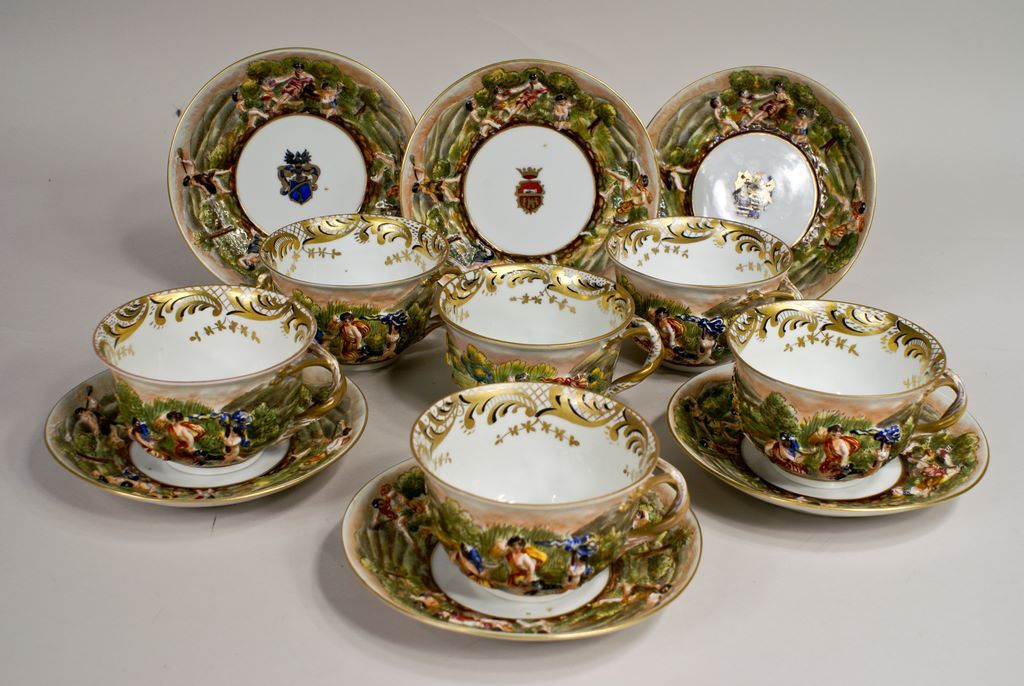 Matching items #134 & #135, a set of six late 19th Century Capodimonte porcelain coffee cup and saucers, each with finely hand painted classical scenes in bas relief, and all with intricate and extensive gilding. Each of the saucers is hand painted Matching items #134 & #135, a set of six late 19th Century Capodimonte porcelain coffee cup and saucers, each with finely hand painted classical scenes in bas relief, and all with intricate and extensive gilding. Each of the saucers is hand painted