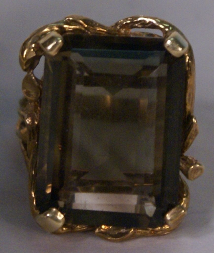 A ladies 10k yellow gold ring set with a 20 x 15 millimeter smoky quartz stone. A ladies 10k yellow gold ring set with a 20 x 15 millimeter smoky quartz stone.