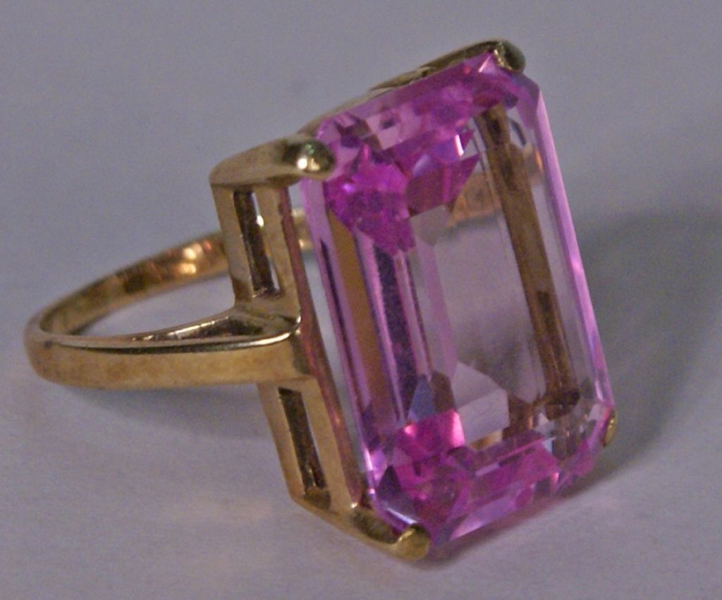A ladies ring with a 20 x 15 pink cubic zirconia stone set in an unstamped yellow gold mounting. A ladies ring with a 20 x 15 pink cubic zirconia stone set in an unstamped yellow gold mounting.
