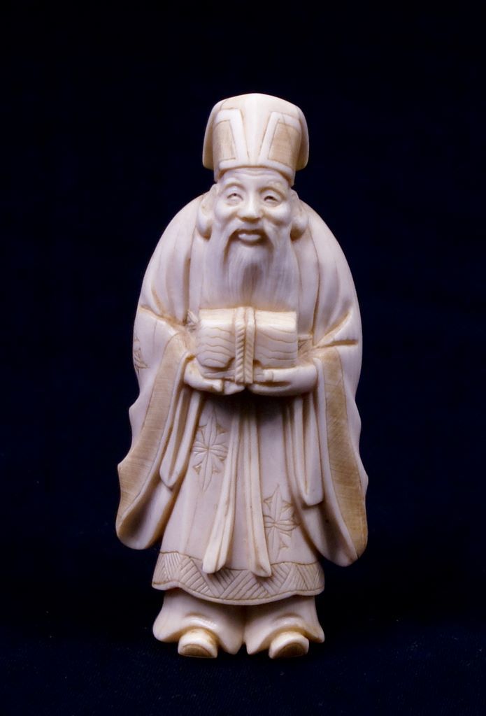 A 3"h 1920s Japanese ivory figure of a scholar, with incised "Japan" and two character signature marks to base. A 3"h 1920s Japanese ivory figure of a scholar, with incised "Japan" and two character signature marks to base.
