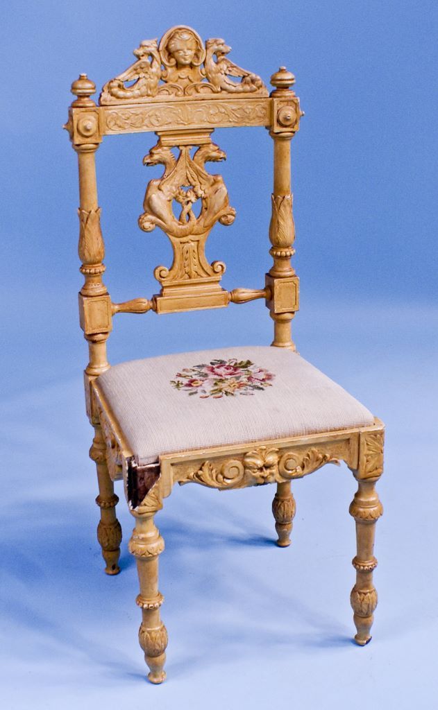 A Victorian Gothic side chair with needlepoint seat elaborately carved with winged griffins and other mythological figures, 40 1/2"h x 17"d. A Victorian Gothic side chair with needlepoint seat elaborately carved with winged griffins and other mythological figures, 40 1/2"h x 17"d.