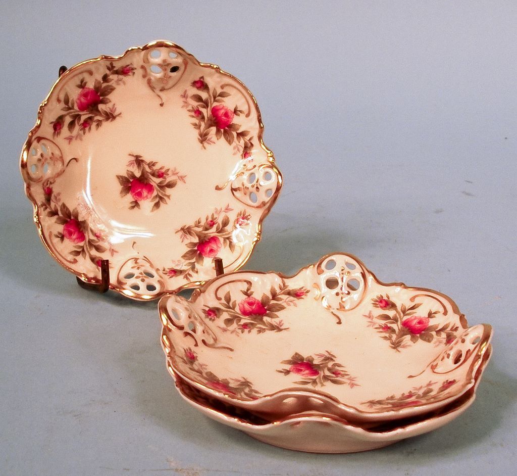 A matched set of three Rosenthal, Germany, reticulated 4" nut dishes in ivory "Moosrose/Moss Rose" pattern. A matched set of three Rosenthal, Germany, reticulated 4" nut dishes in ivory "Moosrose/Moss Rose" pattern.
