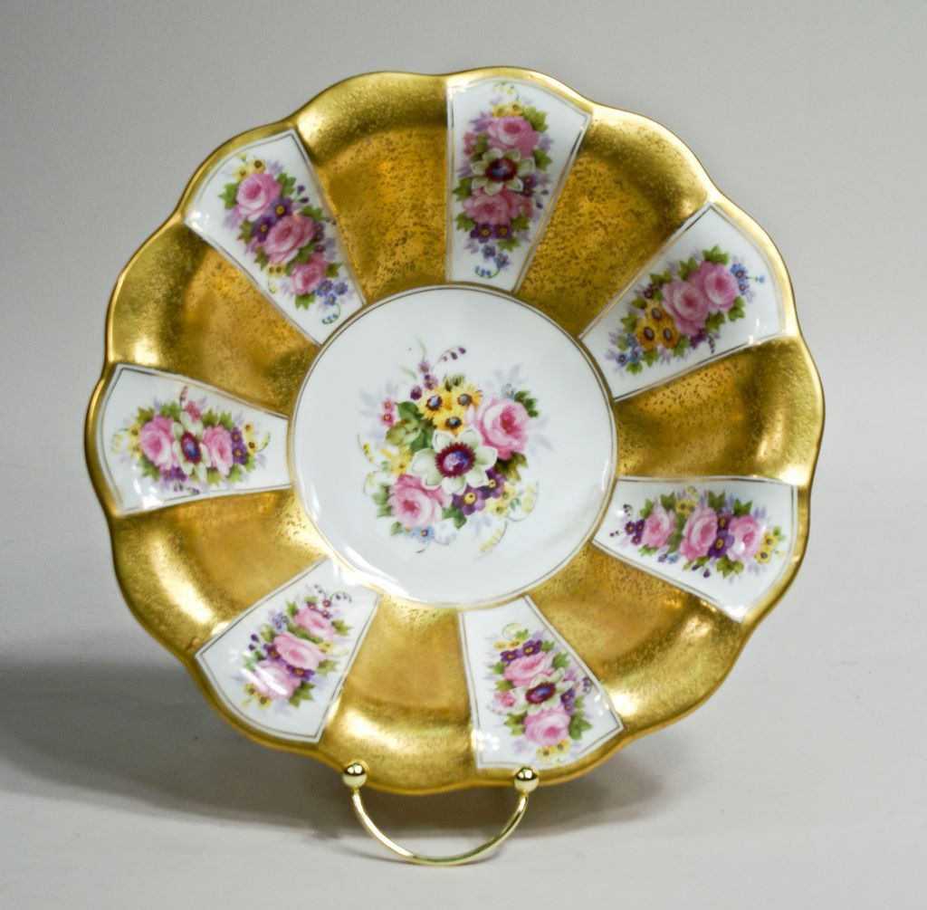 A finely decorated 1920s Noritake bride's bowl, 10"w x 3"h, featuring panels of hand painted flowers alternating with textured panels of 22k gilt. Red "M-in-Wreath" Noritake mark. A finely decorated 1920s Noritake bride's bowl, 10"w x 3"h, featuring panels of hand painted flowers alternating with textured panels of 22k gilt. Red "M-in-Wreath" Noritake mark.