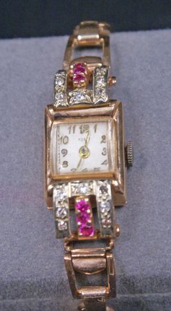 A Robot lady's watch in an unstamped rose gold case with six rubies and fourteen diamonds, single cut to rose cut, with marked 14k watch band, not running. A Robot lady's watch in an unstamped rose gold case with six rubies and fourteen diamonds, single cut to rose cut, with marked 14k watch band, not running.