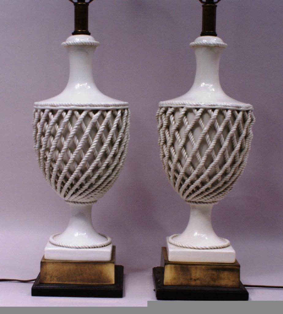 An elegant matched pair of Hollywood Regency faience urn-shaped table lamps, each 32"h to top of harp, decorated with applied ropes in a diamond grid pattern and mounted on two-tiered brass bases. Both topped with matching Chinese brass finials, one An elegant matched pair of Hollywood Regency faience urn-shaped table lamps, each 32"h to top of harp, decorated with applied ropes in a diamond grid pattern and mounted on two-tiered brass bases. Both topped with matching Chinese brass finials, one