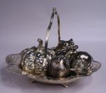 Five pieces of "Two's Company" silverplate fruit, including a 8"w cluster of grapes, a 6"w pumpkin squash, and a smaller orange, lemon and pear, in a Silverplate Reticulated Brides Basket. Five pieces of "Two's Company" silverplate fruit, including a 8"w cluster of grapes, a 6"w pumpkin squash, and a smaller orange, lemon and pear, in a Silverplate Reticulated Brides Basket.