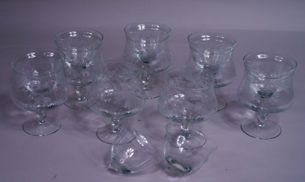 A matched set of seven elegant crystal 5 1/2"h shrimp cocktail icers with glass insert liners, engraved in vintage grape pattern. A matched set of seven elegant crystal 5 1/2"h shrimp cocktail icers with glass insert liners, engraved in vintage grape pattern.