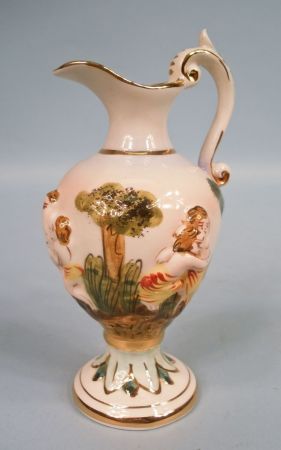 A hand painted and gilded 7 1/4" Capodimonte ewer decorated with cherubic scenes. Marked with a Crown-over-N, "DRS" above, and "Capodimonte" within a banner below. A hand painted and gilded 7 1/4" Capodimonte ewer decorated with cherubic scenes. Marked with a Crown-over-N, "DRS" above, and "Capodimonte" within a banner below.