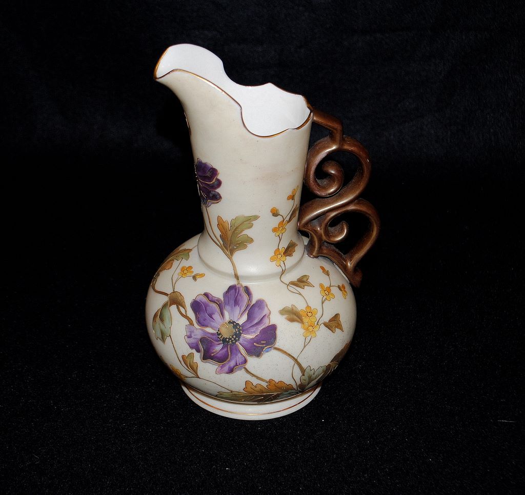 19th Century Gilt Carlsbad Austrian Porcelain Ewer. Hand painted purple flowers, signed on base, 8 1/4"h 19th Century Gilt Carlsbad Austrian Porcelain Ewer. Hand painted purple flowers, signed on base, 8 1/4"h