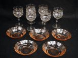 Set of Five Pink Depression Glass Fruit Dishes along with a set of eight clear depression glass glasses with fancy etching. 6 1/2"h Set of Five Pink Depression Glass Fruit Dishes along with a set of eight clear depression glass glasses with fancy etching. 6 1/2"h