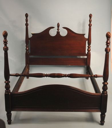 Broken Pediment style headboard with flame (broken finial in center and same finial on top of each post.) 59.5"h, 54"w, 76"L. Broken Pediment style headboard with flame (broken finial in center and same finial on top of each post.) 59.5"h, 54"w, 76"L.