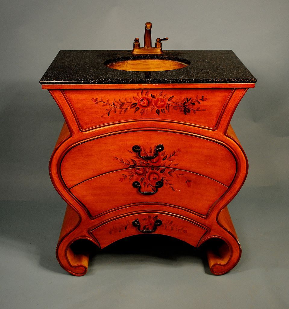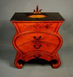 Hand painted chest. Black and White marble top with brass sink and brass hardware. Unusual arched shaped drawer (3) 33"w 21 1/2"d 36"h Hand painted chest. Black and White marble top with brass sink and brass hardware. Unusual arched shaped drawer (3) 33"w 21 1/2"d 36"h