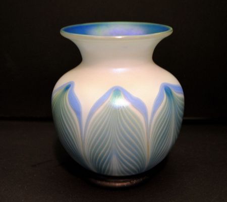 Art Glass Vase. Signed Vandermark MVO9 iridescent pulled feather, quezal style vase. Light blue and green feathers, 5 3/8"h Art Glass Vase. Signed Vandermark MVO9 iridescent pulled feather, quezal style vase. Light blue and green feathers, 5 3/8"h