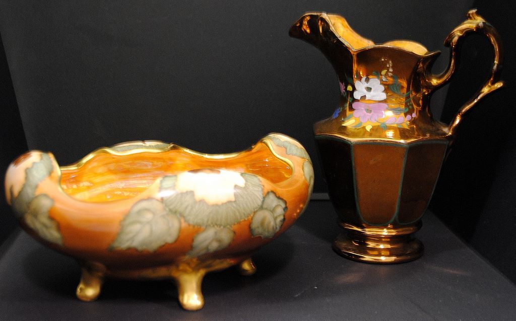 Two Pieces Lusterware. One copper color with hand painted pitcher, 8"h, One footed orange and green fruit bowl. 9 1/2"w 4"h Two Pieces Lusterware. One copper color with hand painted pitcher, 8"h, One footed orange and green fruit bowl. 9 1/2"w 4"h