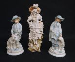Pair of Porcelain Figurines of young boy and your girl with dog, 10"h, along with bisque figure of Lady at a Fence, Wear on Paint, 12 1/2"h Pair of Porcelain Figurines of young boy and your girl with dog, 10"h, along with bisque figure of Lady at a Fence, Wear on Paint, 12 1/2"h