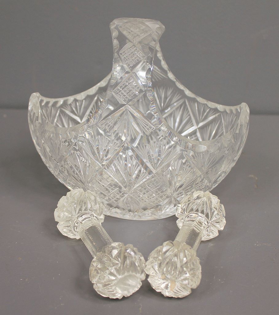 Three Pieces of Cut Glass, small cut glass basket with thumb print edge; 7" w., 6 1/2" h., pair cut glass knife rests 4" w. Three Pieces of Cut Glass, small cut glass basket with thumb print edge; 7" w., 6 1/2" h., pair cut glass knife rests 4" w.