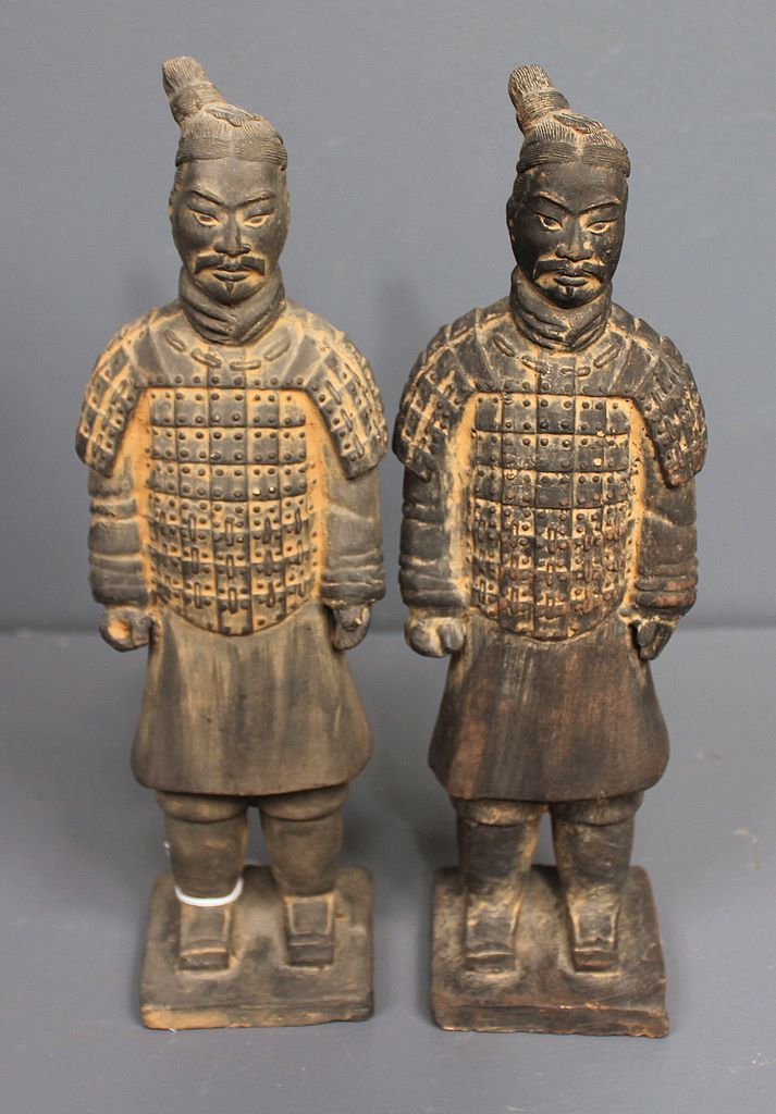 Pair of Terra Cotta Figurines, Chinese Warrior Figurines, painted black on terra cotta, some wear; 10 1/2" h. Pair of Terra Cotta Figurines, Chinese Warrior Figurines, painted black on terra cotta, some wear; 10 1/2" h.