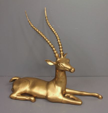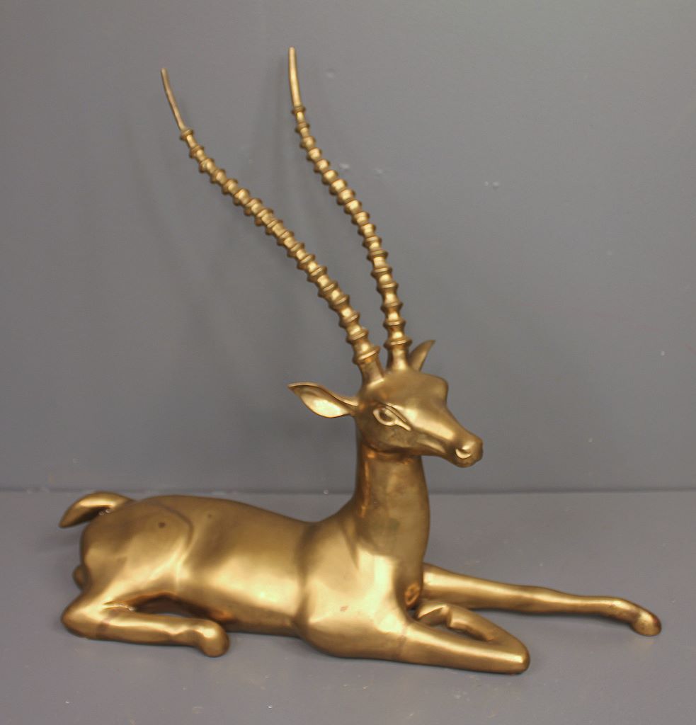 Vintage Reclining Brass Deer, Frederick Cooper stylish reclining brass deer with ring design antlers; 24 1/2" w., 21" h. Vintage Reclining Brass Deer, Frederick Cooper stylish reclining brass deer with ring design antlers; 24 1/2" w., 21" h.