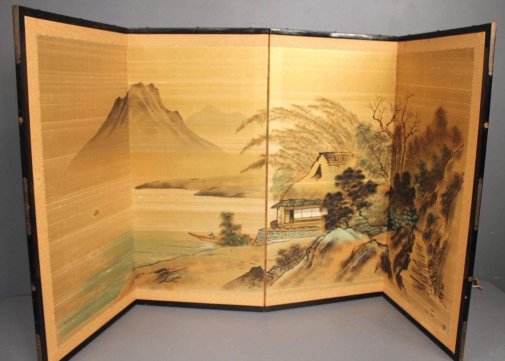 Vintage Hand Painted Folding Screen, four panel folding screen with hand painting of oriental house and landscape, done on silk in black frame; each panel 18 1/4" w., 36 1/2" h. Vintage Hand Painted Folding Screen, four panel folding screen with hand painting of oriental house and landscape, done on silk in black frame; each panel 18 1/4" w., 36 1/2" h.