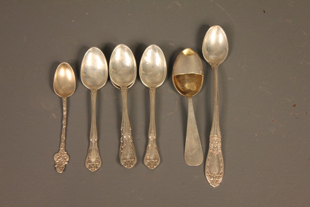Eight Pieces of Sterling, including four demitasse spoons "Chateau rose" by Alvin, 4" sterling infant spoon 4", sterling infant feeding spoon, 5 1/4" on international "Richelieu" demitasse, 4", one sterling demitasse 3 1/2" Eight Pieces of Sterling, including four demitasse spoons "Chateau rose" by Alvin, 4" sterling infant spoon 4", sterling infant feeding spoon, 5 1/4" on international "Richelieu" demitasse, 4", one sterling demitasse 3 1/2"