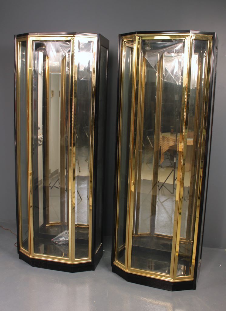 Matching Pair of Lighted Black Lacquer Beveled Glass Display Cabinets; 29 1/2" w., 82" h., 16" d. Matching Pair of Lighted Black Lacquer Beveled Glass Display Cabinets; 29 1/2" w., 82" h., 16" d.
