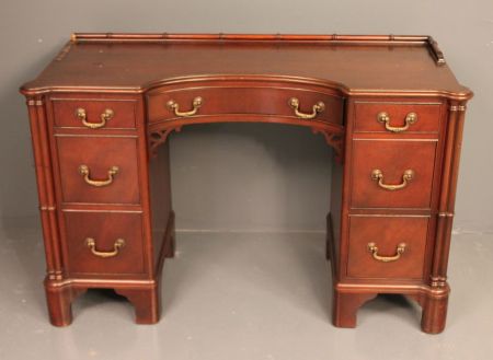 Chinese Chippendale Style Desk, matches next lot. This desk has matching pieces. All were made by Swern Company, center drawer flanked by three drawers on each side. Has chippendale bracket feet; 30" h., 47" w., 20" d. Chinese Chippendale Style Desk, matches next lot. This desk has matching pieces. All were made by Swern Company, center drawer flanked by three drawers on each side. Has chippendale bracket feet; 30" h., 47" w., 20" d.