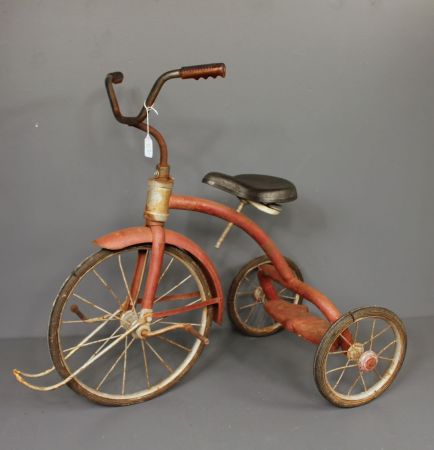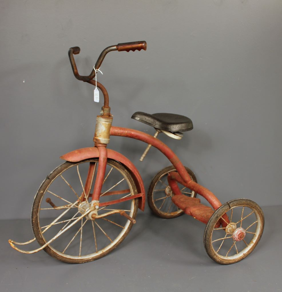Vintage Tricycle, some rust, missing rubber on petals; 29" h., 32 1/2" w. Vintage Tricycle, some rust, missing rubber on petals; 29" h., 32 1/2" w.