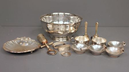 Group of Silverplate Items, includes; bowl, bells, nut dishes, napkin rings. Various silverplate pieces. Large bowl 8 1/2" diameter 2 - 4 1/2"h. dinner bell, cork screw, 3" diameter nut dishes, 6 1/8" shell shaped dish. Group of Silverplate Items, includes; bowl, bells, nut dishes, napkin rings. Various silverplate pieces. Large bowl 8 1/2" diameter 2 - 4 1/2"h. dinner bell, cork screw, 3" diameter nut dishes, 6 1/8" shell shaped dish.