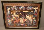 Colorful Print of Peacocks, fans of flowers, gold oriental design border, in Black Frame; 39" h., 50" w. Colorful Print of Peacocks, fans of flowers, gold oriental design border, in Black Frame; 39" h., 50" w.